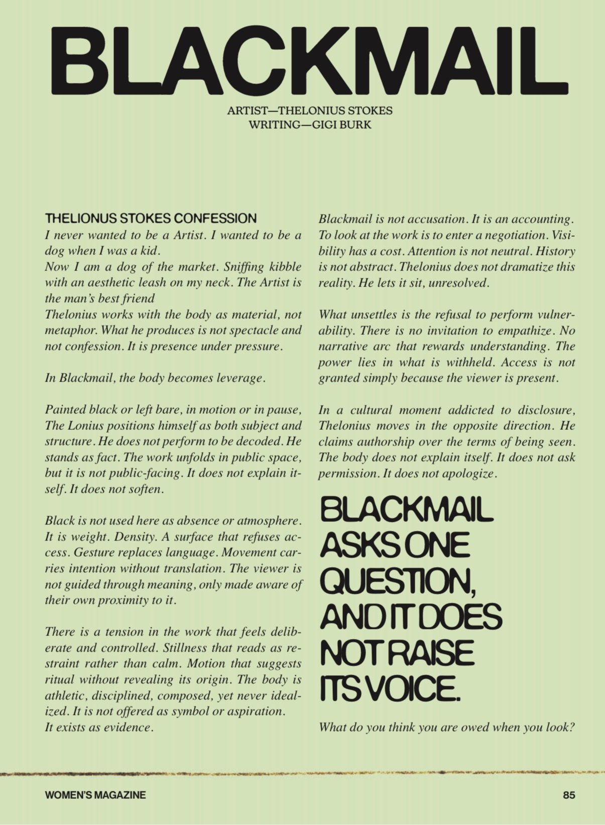 I messaged him impulsively, without a pitch or a plan, simply out of curiosity. We were on a call soon after, which in itself felt unusual in an era where artists are often buffered by distance and intermediaries. Thelonious was direct, thoughtful, and open, speaking about his work not as content but as necessity. At one point I nearly flew to Florence on instinct alone. He teaches art to children there and keeps a studio in the city, and I wanted to understand the environment shaping this fluid, mobile practice. I couldn’t make the trip, so instead I included his self-portraits in Confessional: Blackmail, which felt like the closest form of collaboration possible from a distance.